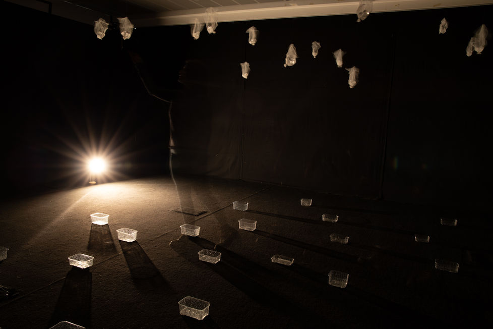 我們已經習慣精確而統一的時間,甚至不太記得沒有時鐘之前我們是如何觀察自然韻律來感受時間。水滴的形成是集合熱、重力、表面張力等許多物理力量的現象,由於環境是隨時變動的,因此冰融化、水落下的速度也是無法精準預測的,許多環境變因都能改變理想中應該要固定的韻律。我將冰塊放在網袋中,正下方地面上放置墊有金屬片的塑膠容器,當冰逐漸融化之時,水滴就會隨機滴落敲擊金屬片,如同緩慢且難以預測位置的雨聲。